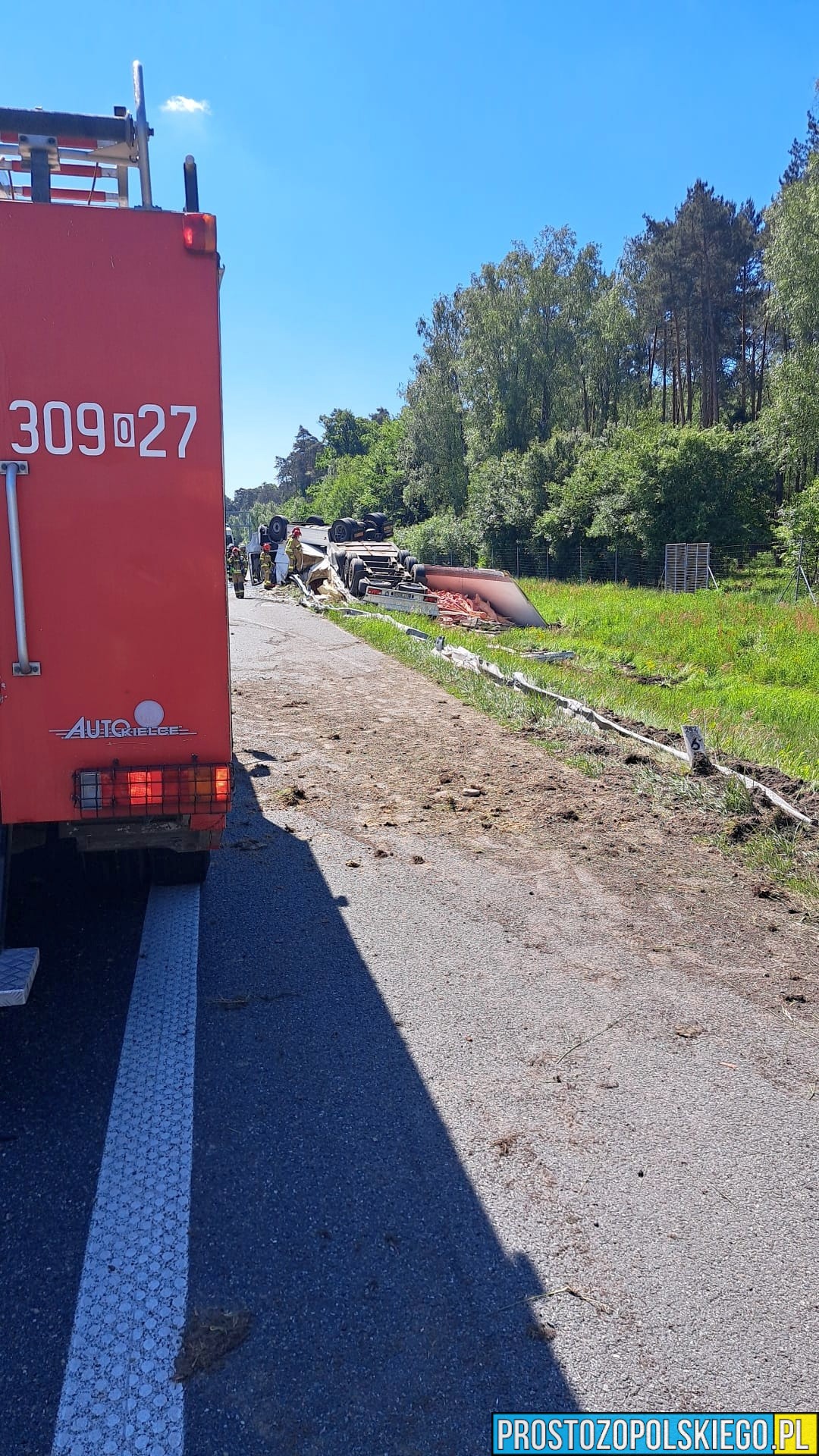 Z przekazanych informacji wynika, że kierowca samochodu ciężarowego marki Volvo (chłodnia) stracił panowanie nad pojazdem po wystrzale opony. Zestaw zjechał na pobocze i dachował. Ciężarówka przewoziła tusze mięsne.