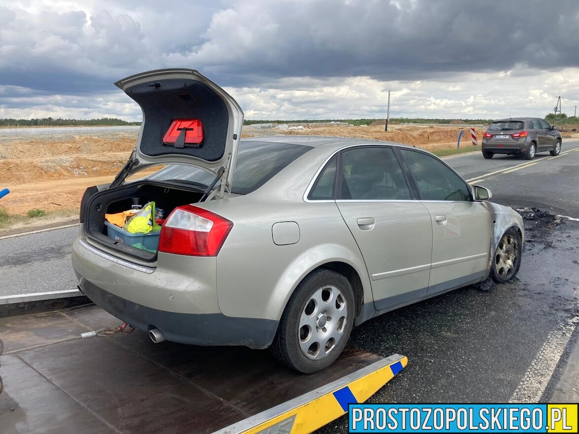 Kierujący audi w czasie jazdy zauważył ,że spod maski wydobywa się ogień, zatrzymał auto i wezwał straż pożarną.