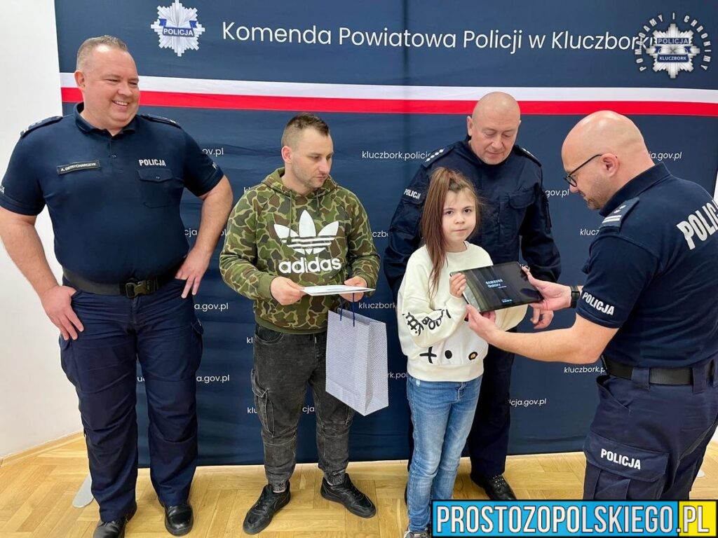 Doceniając postawę Konstancji, Komendant Powiatowy Policji w Kluczborku mł.insp. Andrzej Ostrycharczyk wraz ze swoim zastępcą mł.insp. Łukaszem Gigielem oraz przewodniczącym związków zawodowych NSZZP w Opolu asp.szt. Arturem Kusiem przekazali dziewczynce wymarzony tablet, który zakupiony został ze środków funduszu związkowego i uroczyście wręczony podczas spotkania w komendzie.