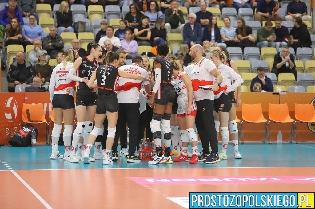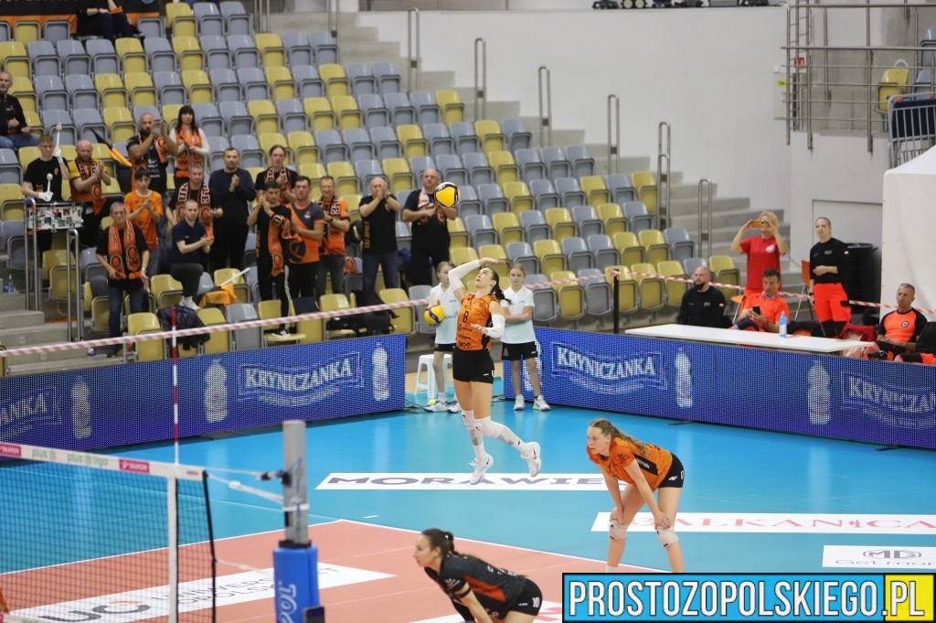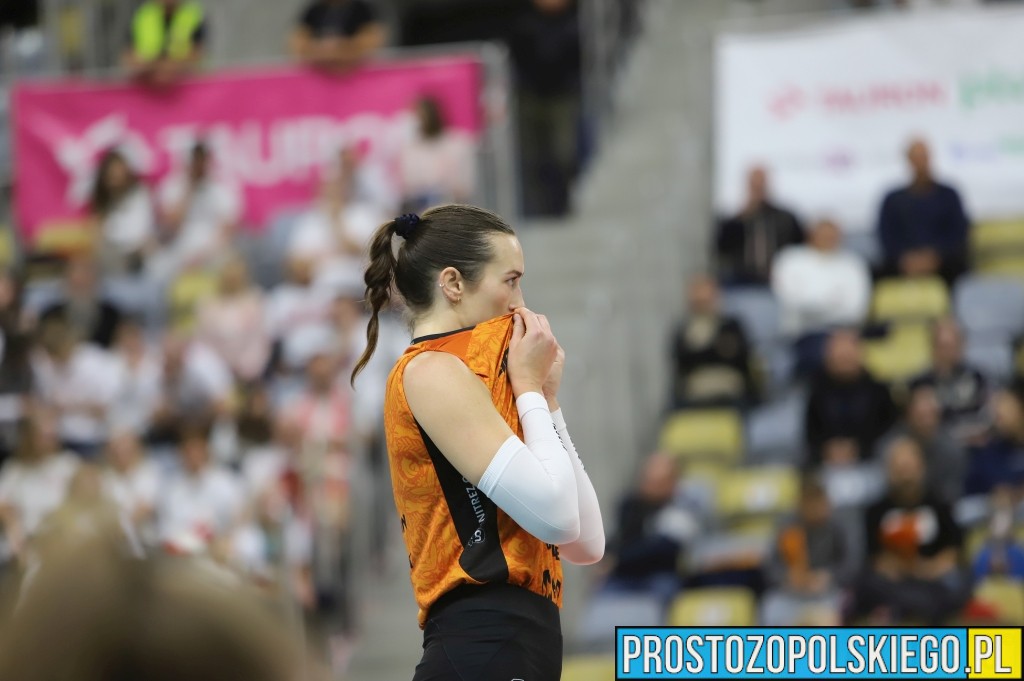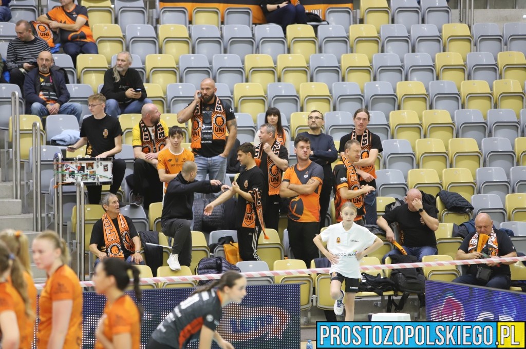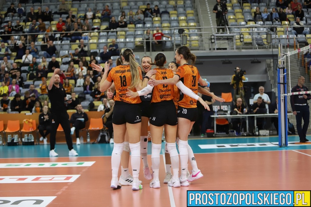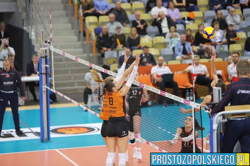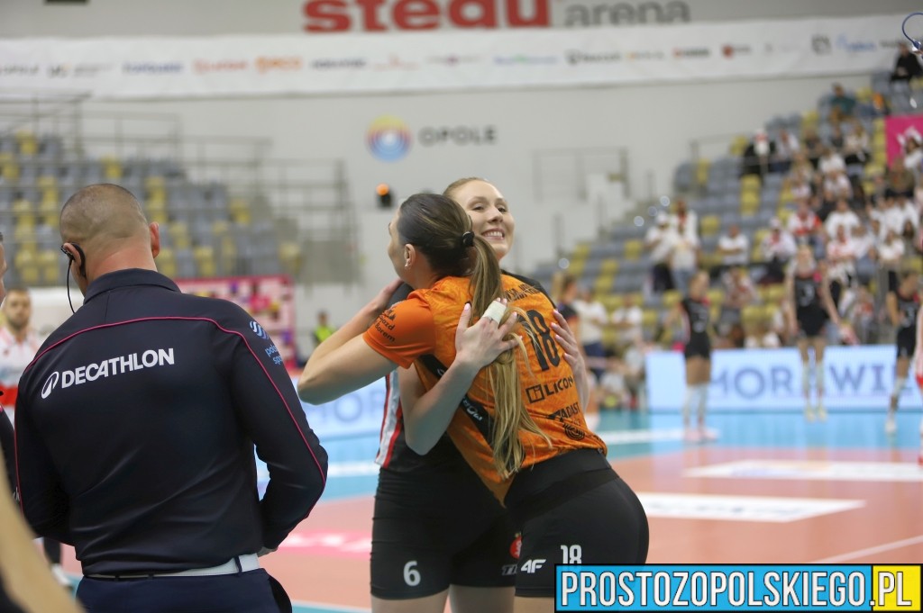 Publiczność w Stegu Arenie żywiołowo reagowała na widowiskowe akcje – szczególnie po mocnym ataku Katarzyny Zaroślińskiej-Król. Niestety, w końcówce seta opolanki popełniły kilka błędów, co skrzętnie wykorzystały łodzianki. Po skutecznym ataku Regiane Bidias, ŁKS zwyciężył 25:23.