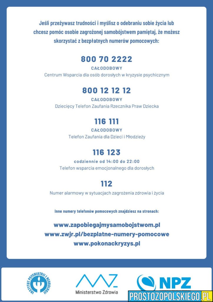 Pamiętajmy, że w sytuacji, kiedy potrzebujemy pomocy, możemy zwrócić się do instytucji, które jej udzielą. Z naszymi problemami nie jesteśmy sami. Wokół nas są ludzie, którzy chcą i potrafią pomóc w różnych sytuacjach. Pomoc możemy uzyskać dzwoniąc pod bezpłatny i anonimowy numer Ogólnopolskiego Centrum Wsparcia dla osób dorosłych w kryzysie psychicznym 116 123.