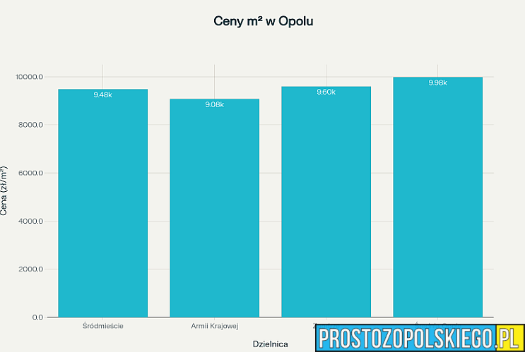 Ceny mieszkań w Opolu wyraźnie pokazują hierarchię dzielnic. Zgodnie z danymi z Adresowo.pl, średnia cena za metr kwadratowy w Opolu wynosi 9 983 zł, przy czym szczegółowe dane pokazują znaczące różnice między poszczególnymi lokalizacjami. Śródmieście, jako serce miasta, utrzymuje stabilnie wysokie ceny na poziomie 9 480 zł/m², co czyni go jednym z drożej wycenianych obszarów. Osiedle Armii Krajowej (ZWM) pozostaje relatywnie bardziej dostępne cenowo, z średnią 9 079 zł/m², co powoduje, że przyciąga inwestorów poszukujących lepszego stosunku ceny do jakości. Zaodrze, zmierzające ku nowocześniejszej infrastrukturze i czystszemu wizerunkowi, wyceniane jest pomiędzy wspomnianymi dzielnicami, na poziomie około 9 600 zł/m².