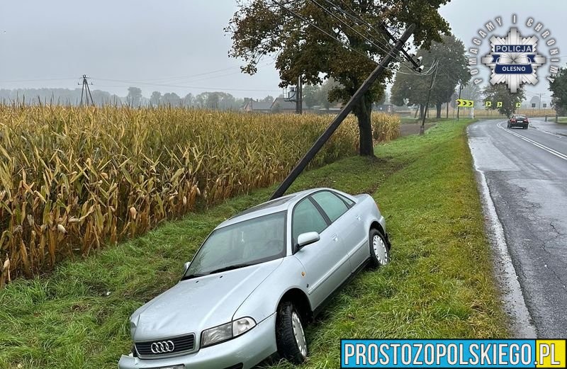 Drugie zdarzenie miało miejsce kilka godzin później. 62-letni kierowca audi, również mieszkaniec powiatu oleskiego, stracił panowanie nad pojazdem i wypadł z drogi. Jego samochód wpadł do rowu i uderzył w słup telekomunikacyjny, który uległ uszkodzeniu.