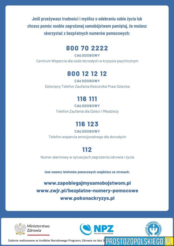 Służby apelują, aby nie bagatelizować sygnałów kryzysu emocjonalnego – zarówno u siebie, jak i u innych. Pomoc można uzyskać w: