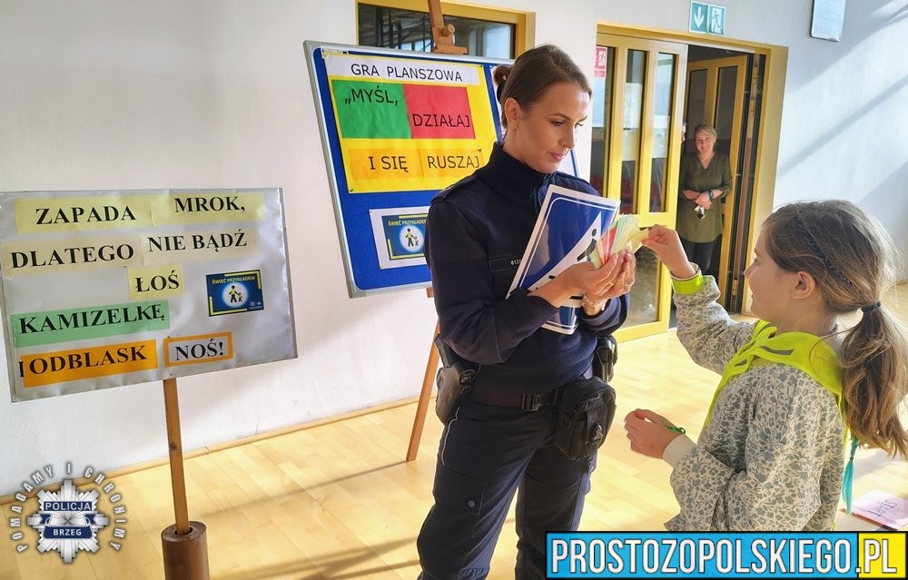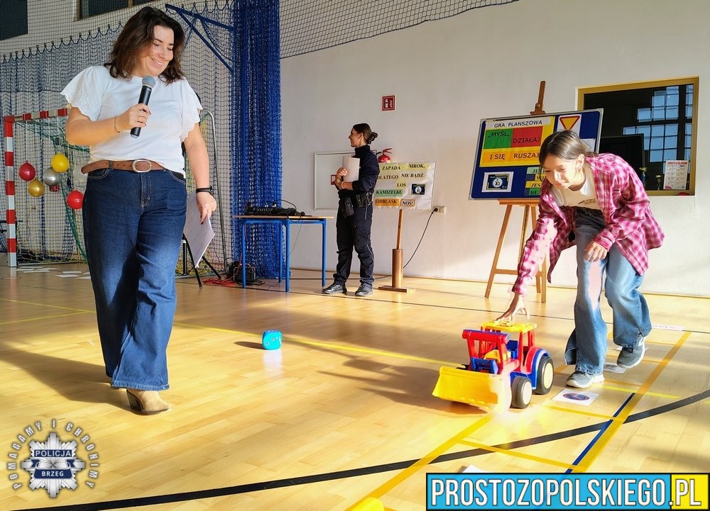 Starsi uczniowie z kolei wzięli udział w grze planszowej, a jedną z jej konkurencji było zmierzenie się z wiedzą w ruchu drogowym. Młodzież losowała pytania, na które musiała znać odpowiedź, aby przeskoczyć na kolejne pola. Oprócz bezpieczeństwa w ruchu drogowym zmierzyli się z matematycznymi działaniami i sportowymi dyscyplinami. Przez dobrą zabawę nauka, a więc idea przedsięwzięcia bardzo dobra. Młodzież utrwaliła sobie istotne dla pieszych i rowerzystów zasady ruchu drogowego, a przy okazji promowała modę na odblaski. Można je przypiąć do kurtki, czapki lub plecaka i nosić tak, by znalazły się w polu działania świateł samochodowych. Opaski, breloczki, odblaskowe torby czy plecaki – możliwości jest wiele, a każda z nich może uratować Twoje zdrowie, a nawet życie. Dlatego „Świeć Przykładem – Noś odblaski”!