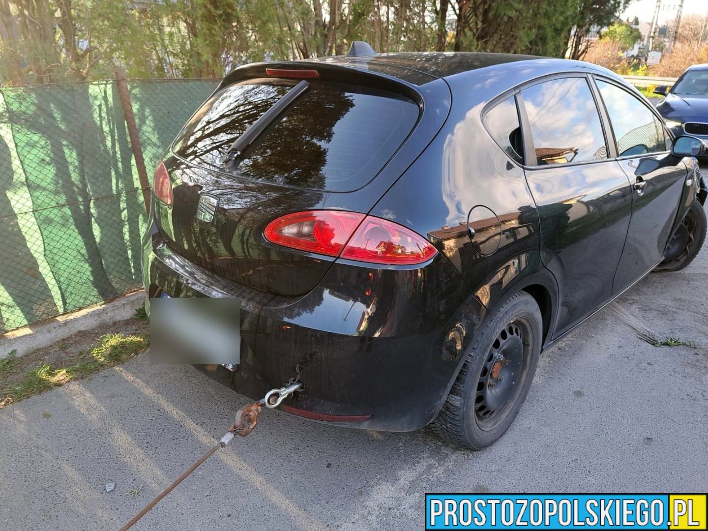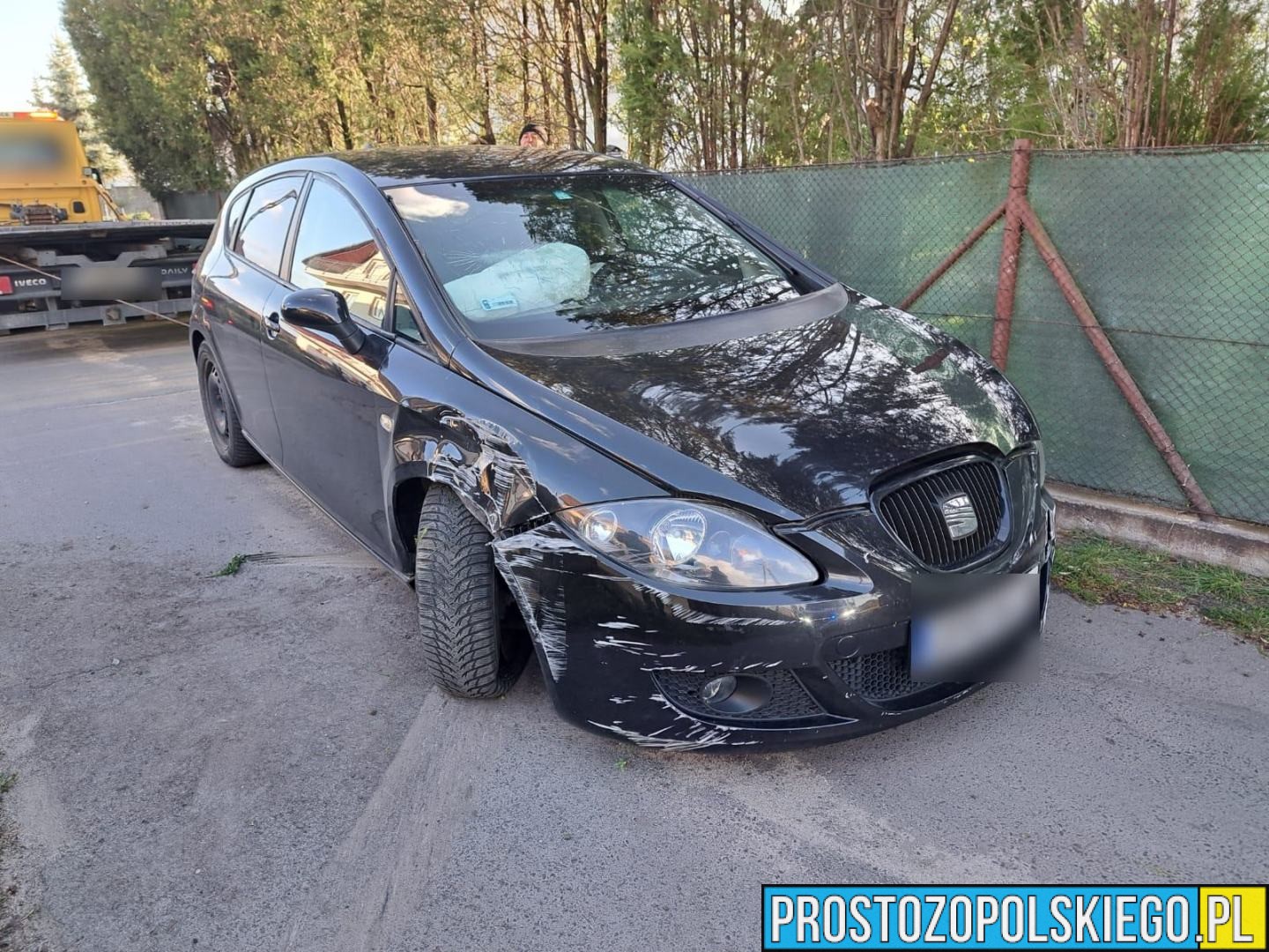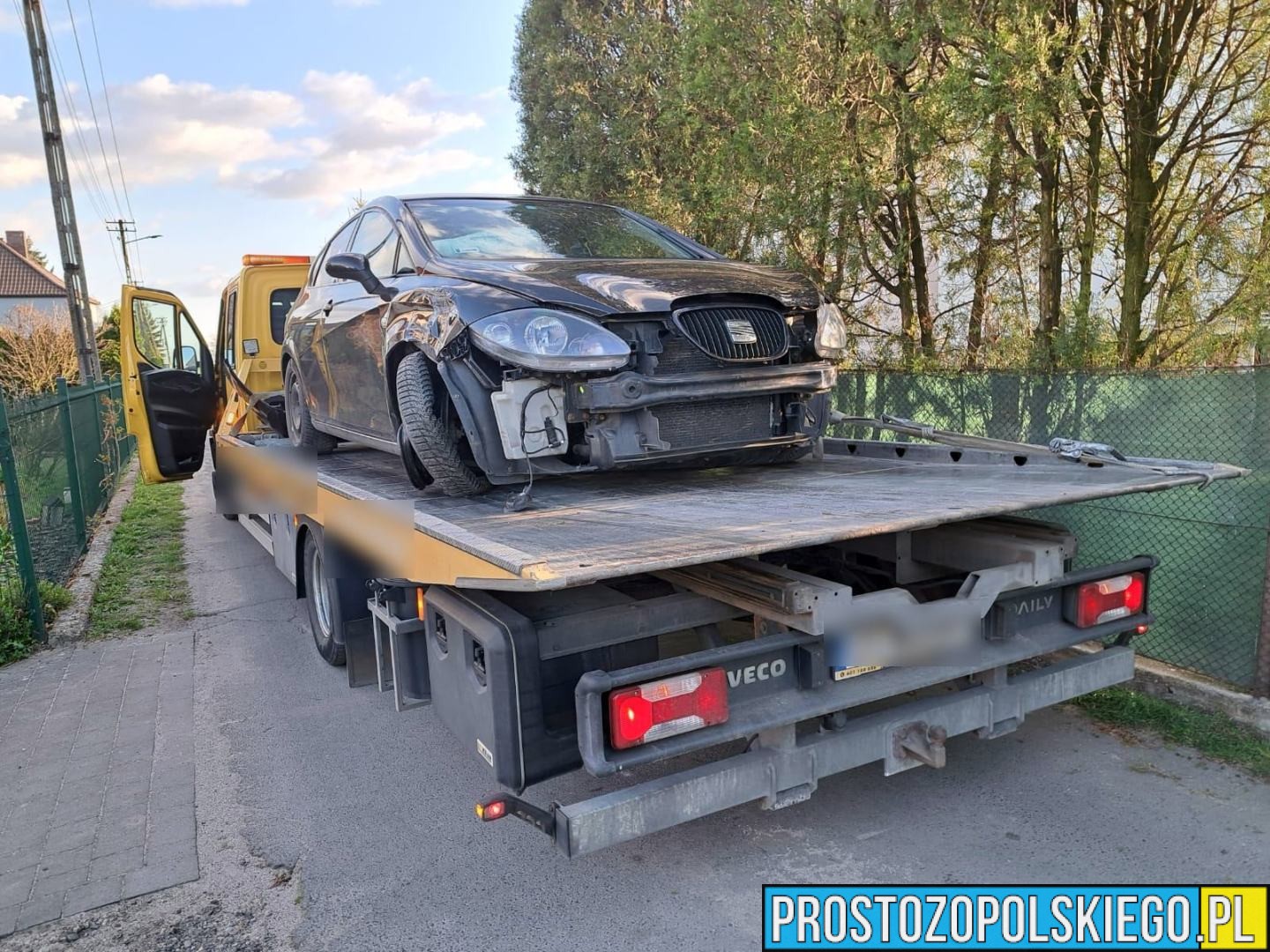Uszkodzony samochód został odholowany przez pomoc drogową na policyjny parking.