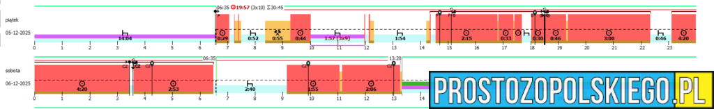 Zestawienie danych z urządzenia rejestrującego oraz kart kierowcy wykazało, że kierujący wielokrotnie i w sposób rażący naruszał obowiązujące normy czasu pracy. Przykładowo, w dniach 5–6 grudnia 2025 roku kierowca prowadził pojazd łącznie przez 19 godzin i 57 minut, przy czym najdłuższa przerwa wyniosła jedynie 2 godziny i 40 minut.
