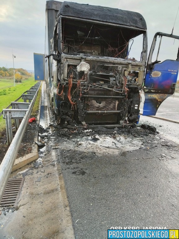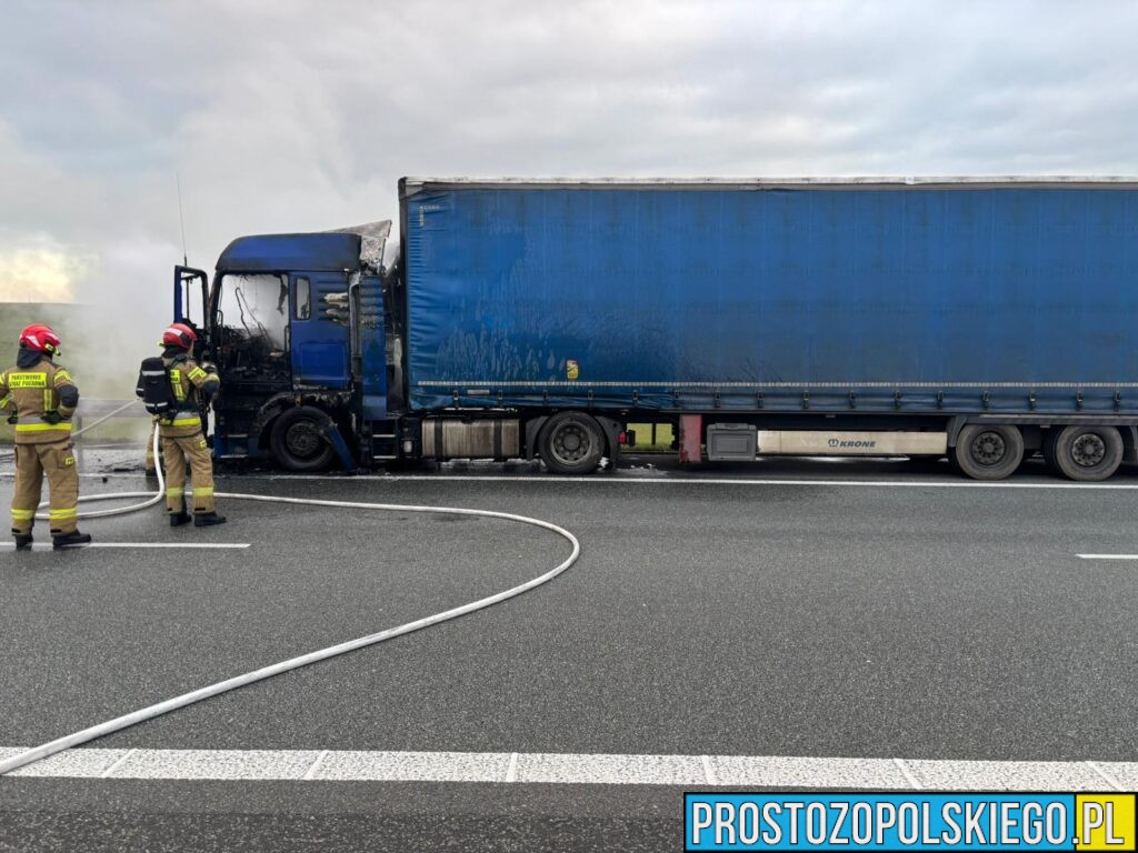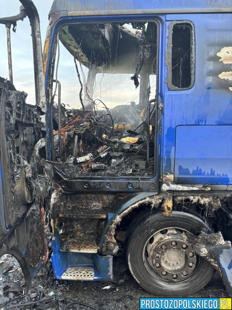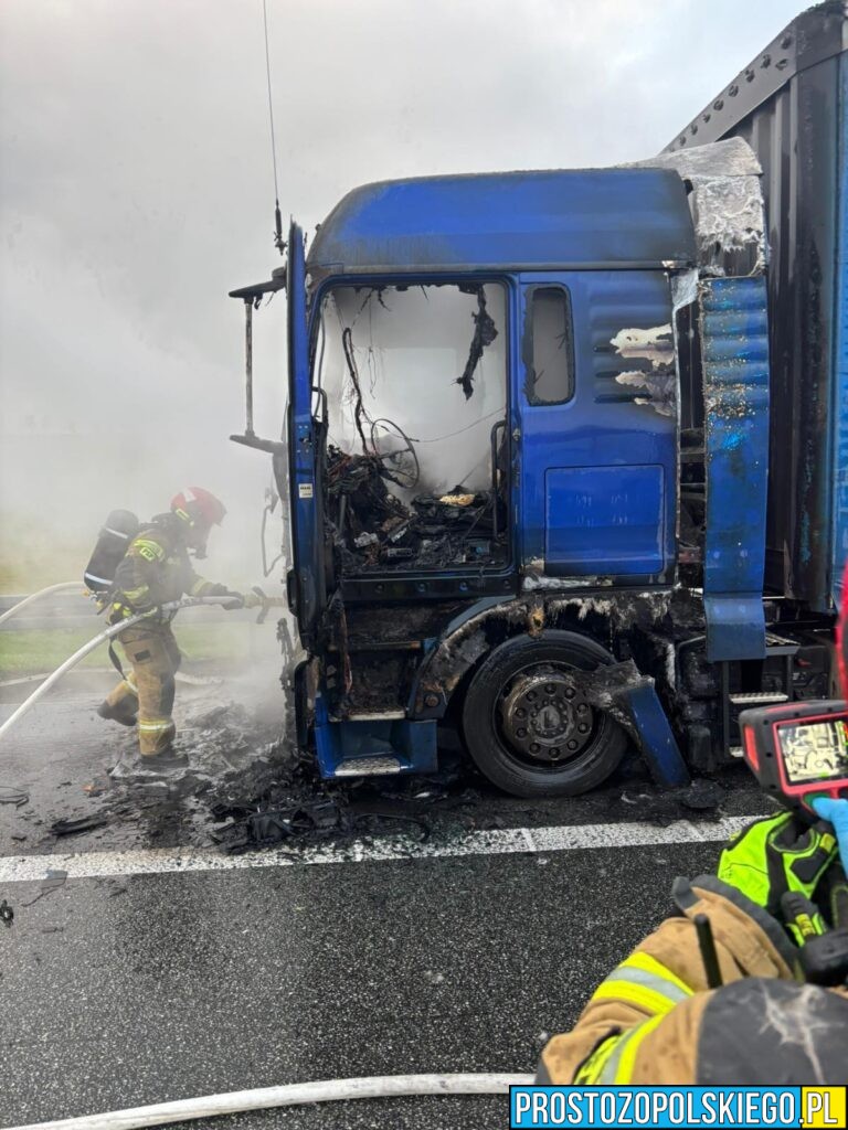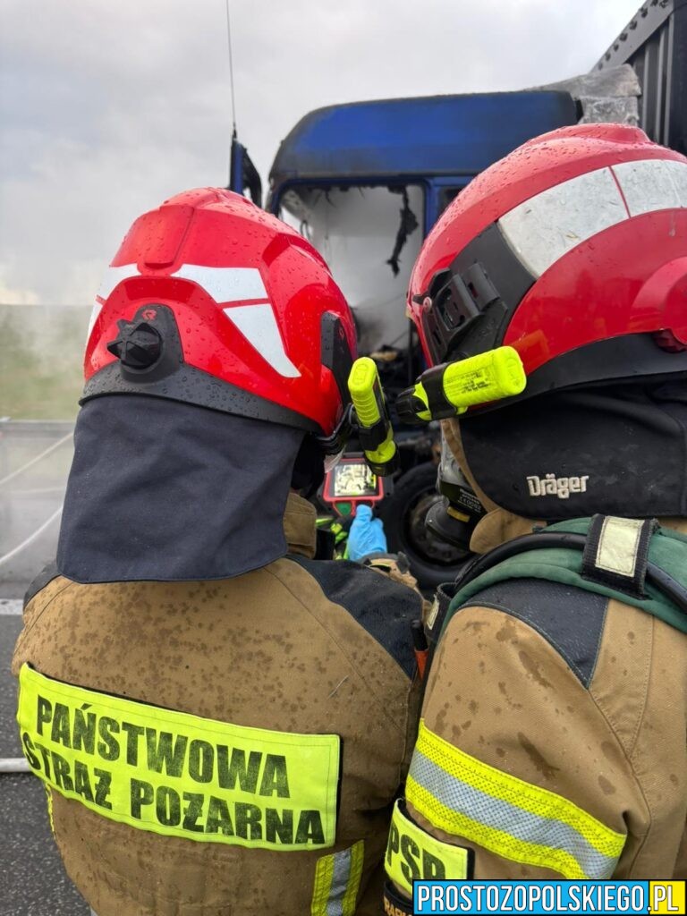 Jak wynika ze wstępnych ustaleń, ogień pojawił się w komorze silnika ciągnika siodłowego. Kierowca natychmiast zareagował – zatrzymał pojazd na pasie awaryjnym i bezpiecznie opuścił kabinę. Na szczęście mężczyźnie nic się nie stało.