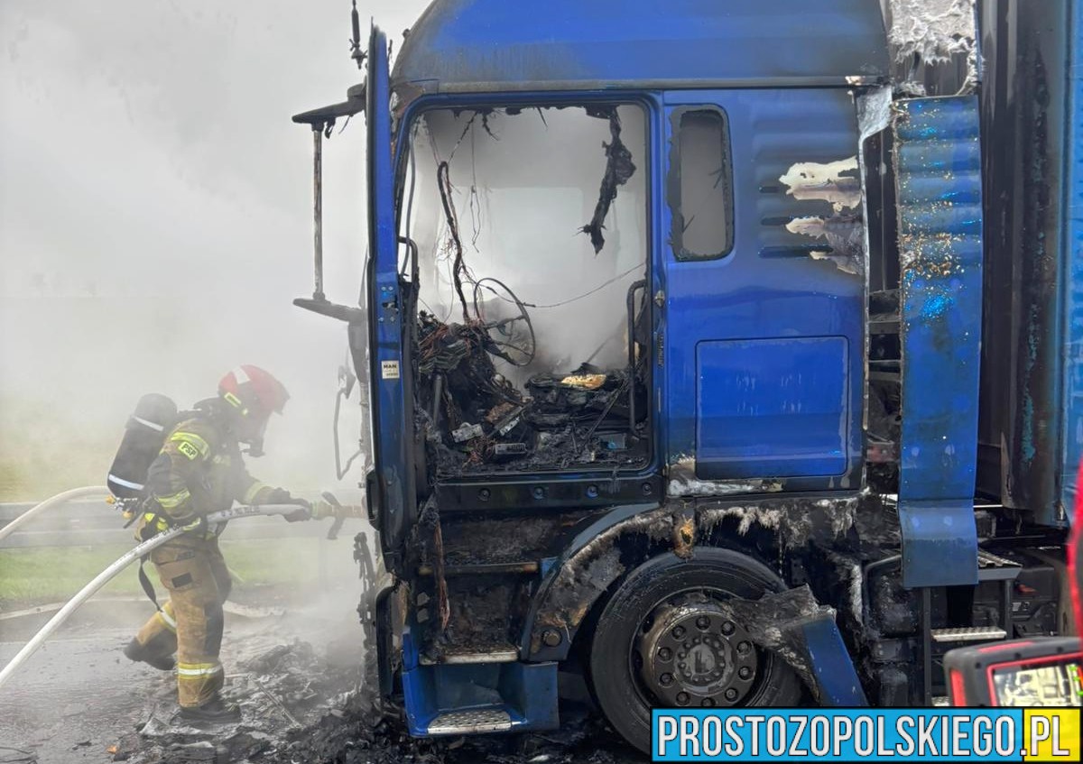 Jak wynika ze wstępnych ustaleń, ogień pojawił się w komorze silnika ciągnika siodłowego. Kierowca natychmiast zareagował – zatrzymał pojazd na pasie awaryjnym i bezpiecznie opuścił kabinę. Na szczęście mężczyźnie nic się nie stało.