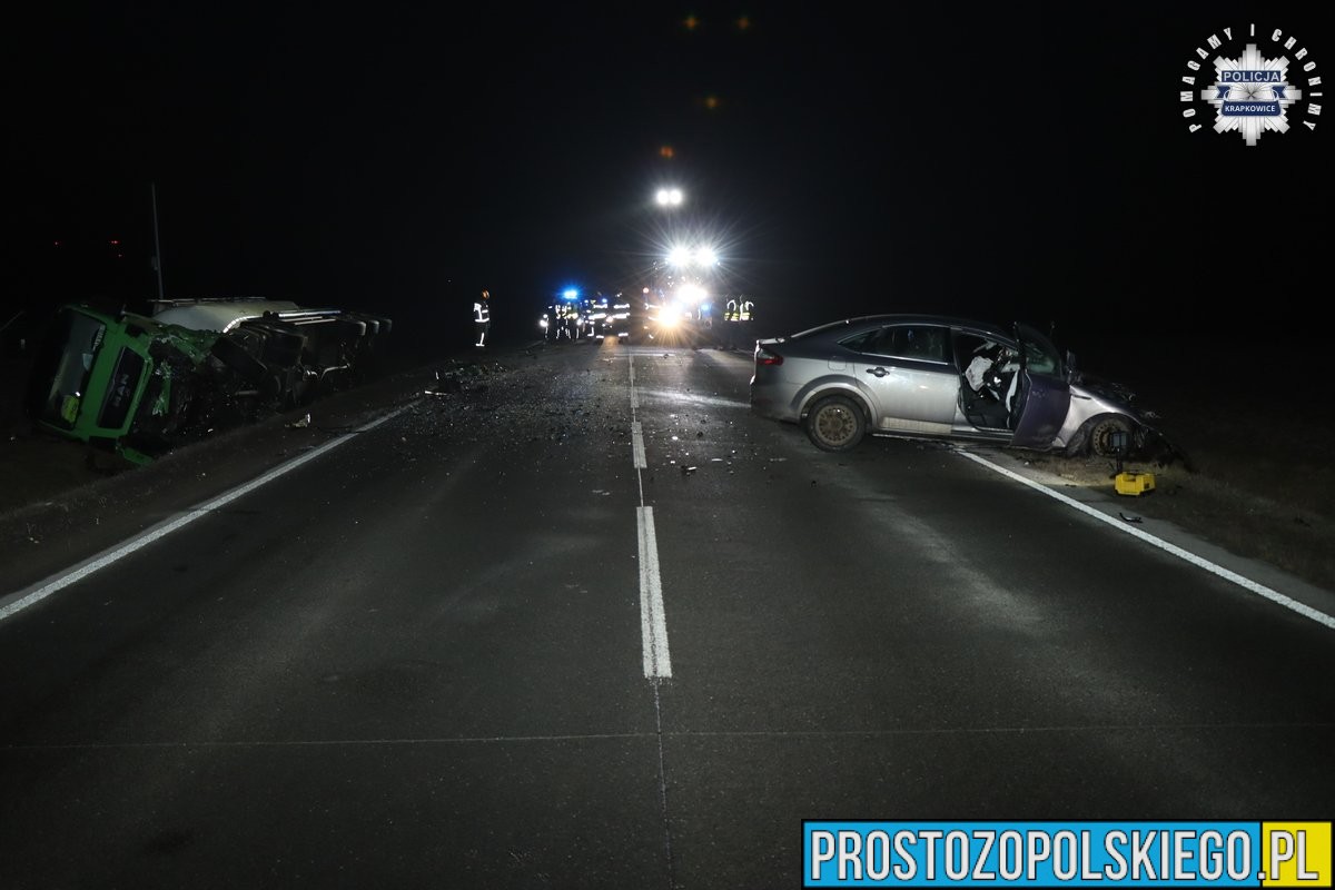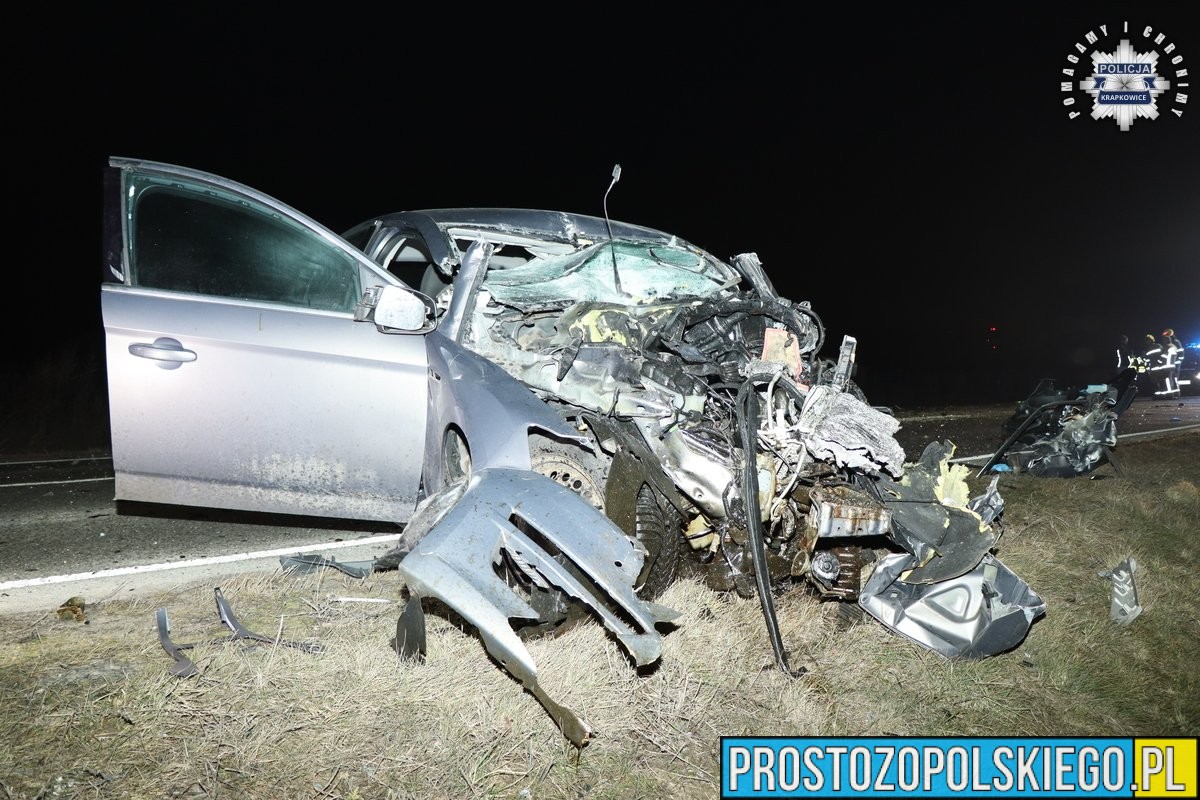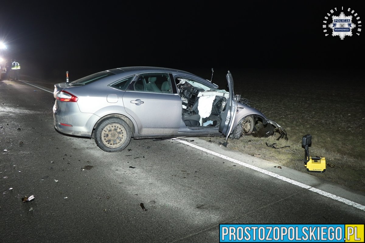 Jak wstępnie ustalili funkcjonariusze Komendy Powiatowej Policji w Krapkowicach, 41-letni kierujący samochodem osobowym marki Ford, z niewyjaśnionych dotąd przyczyn, poruszał się środkiem jezdni, a następnie zjechał na przeciwległy pas ruchu. Jadący z naprzeciwka kierowca samochodu ciężarowego próbował ostrzec go, używając świateł drogowych. Niestety kierujący osobówką nie zareagował i nie zmienił toru jazdy, w wyniku czego doszło do czołowego zderzenia pojazdów.