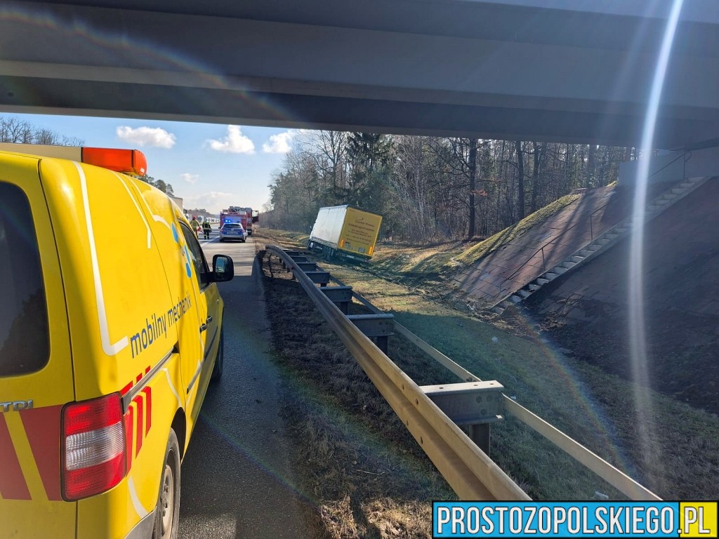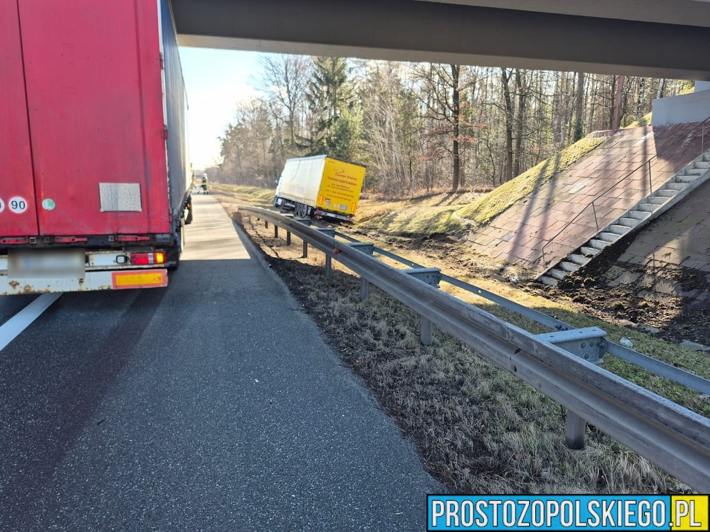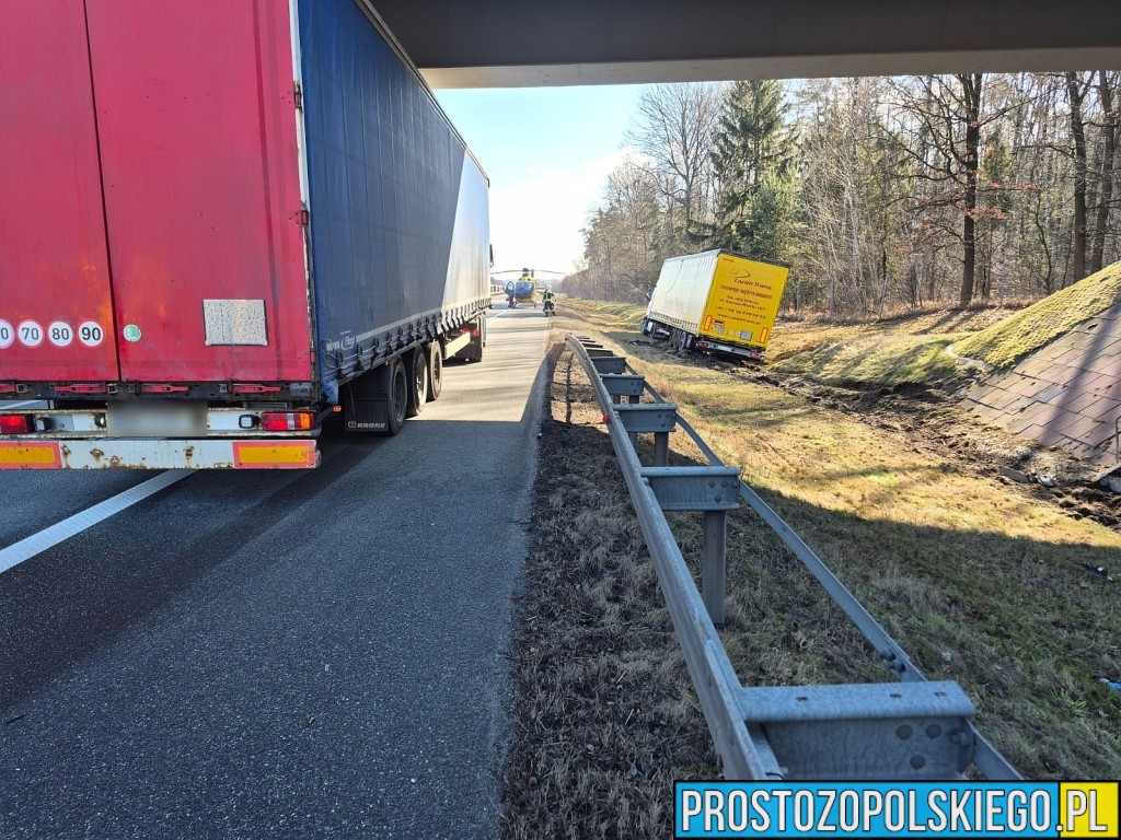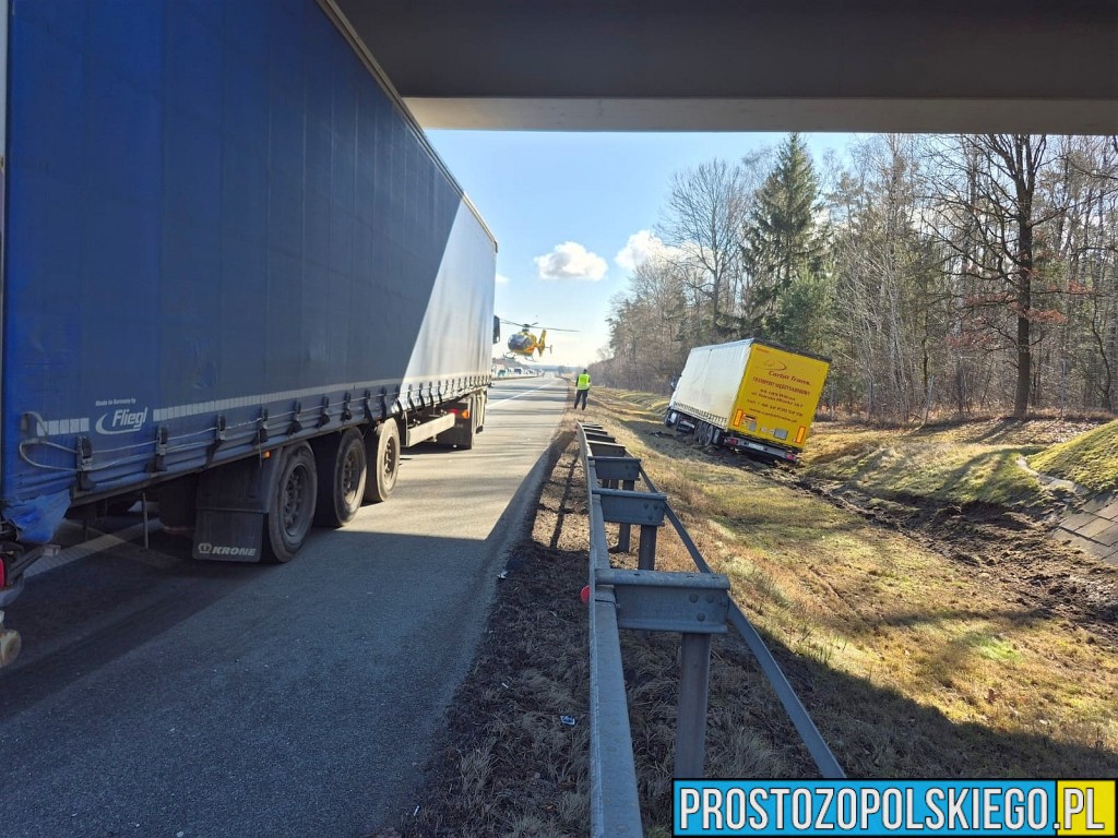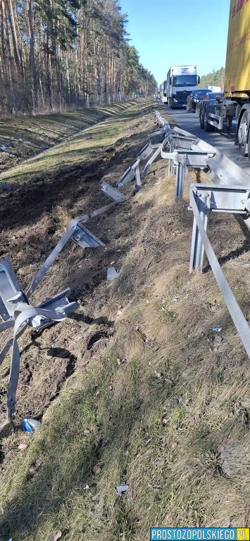 Ze wstępnych ustaleń wynika, że kierujący samochodem ciężarowym stracił panowanie nad zestawem, zjechał z jezdni na pobocze, uszkodził bariery energochłonne, a następnie wpadł do przydrożnego rowu.