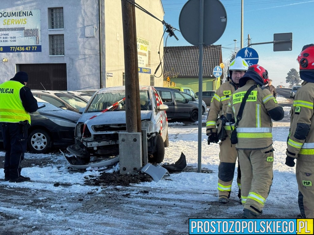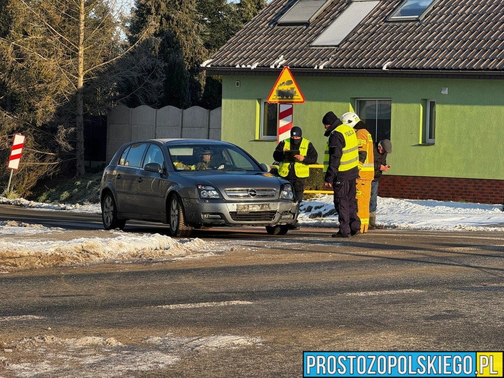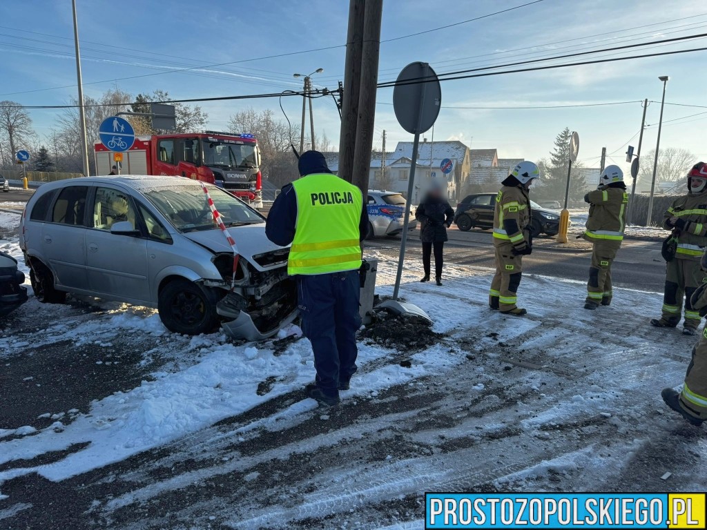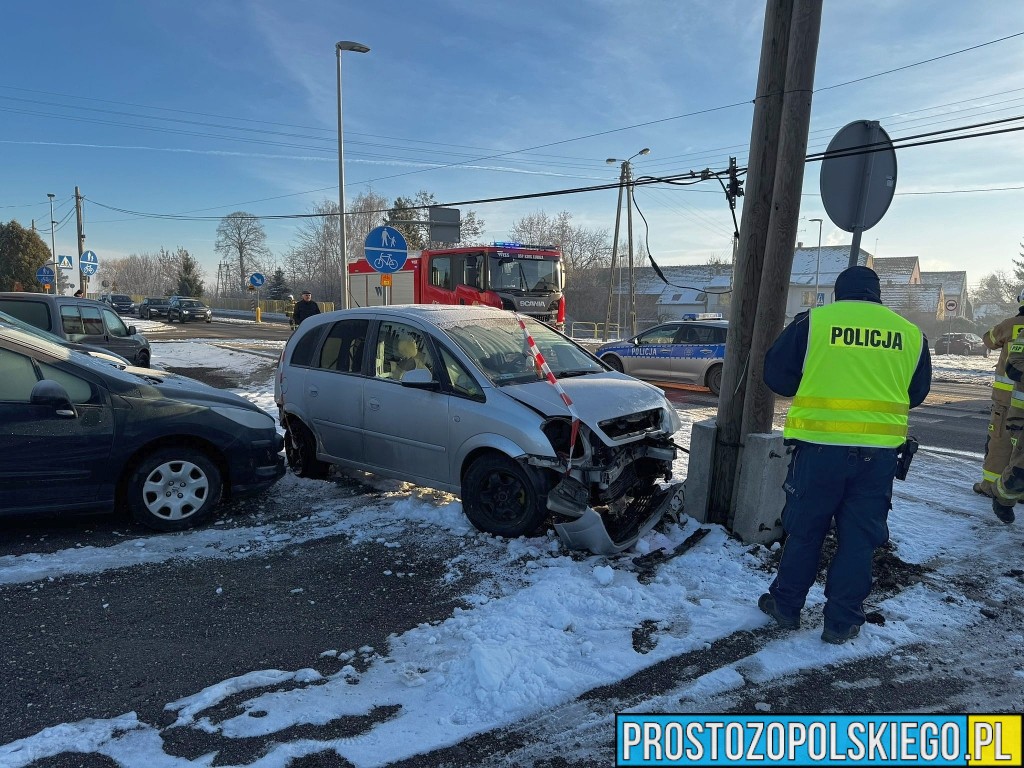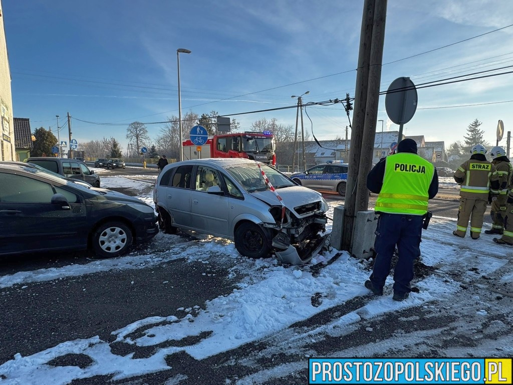 W wyniku zderzenia ranna została jedna osoba, którą Zespół Ratownictwa Medycznego przetransportował do szpitala. Według wstępnych ustaleń doszło do zderzenia dwóch samochodów marki Opel, z których jeden po uderzeniu wypadł z drogi i uderzył w przydrożny słup.