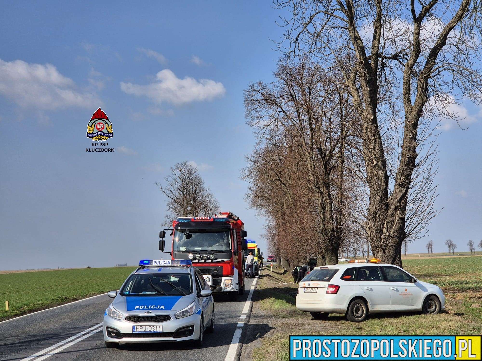 Ze wstępnych informacji wynika, że kierująca samochodem osobowym straciła panowanie nad pojazdem, wypadła z drogi, a następnie uderzyła w drzewo. W zdarzeniu uczestniczyły trzy osoby, w tym dwoje dzieci.