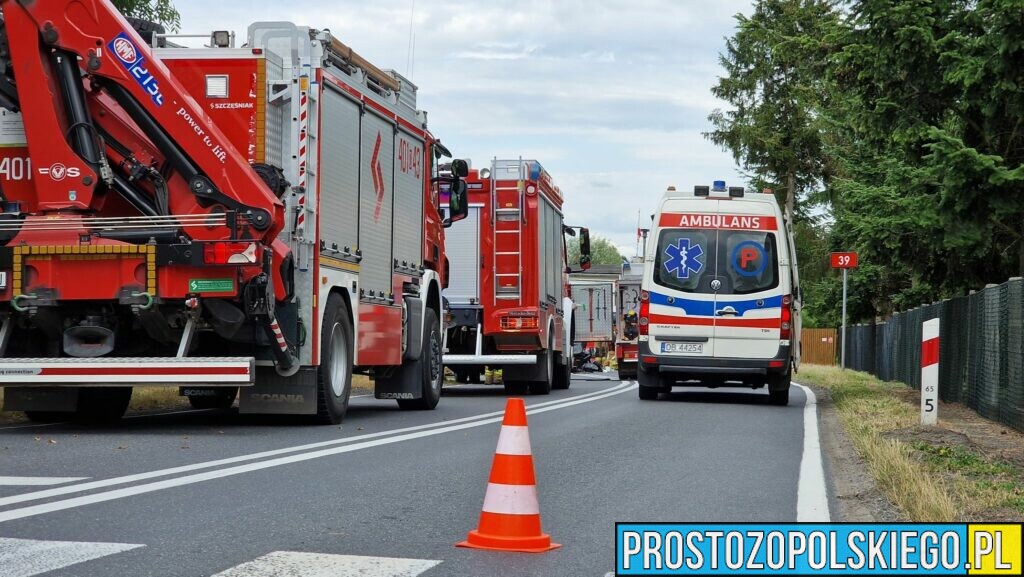Kilka zastępów straży pożarnej, policja oraz śmigłowiec lotniczego pogotowia ratunkowego, prowadzą akcję ratowniczą na drodze krajowej nr 39 w Rogalicach.